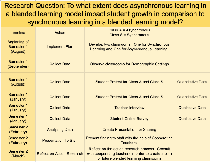 “To what extent does asynchronous learning in a blended learning model impact student growth in comparison to synchronous learning in a blended learning model?”